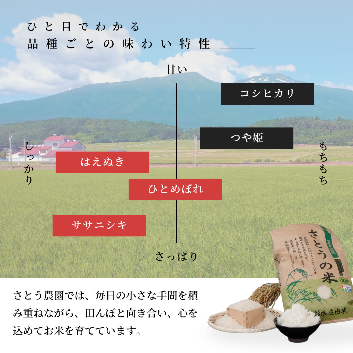 東北を代表する銘柄の個性豊かな違いを、食べ比べセットとしてご用意しました。